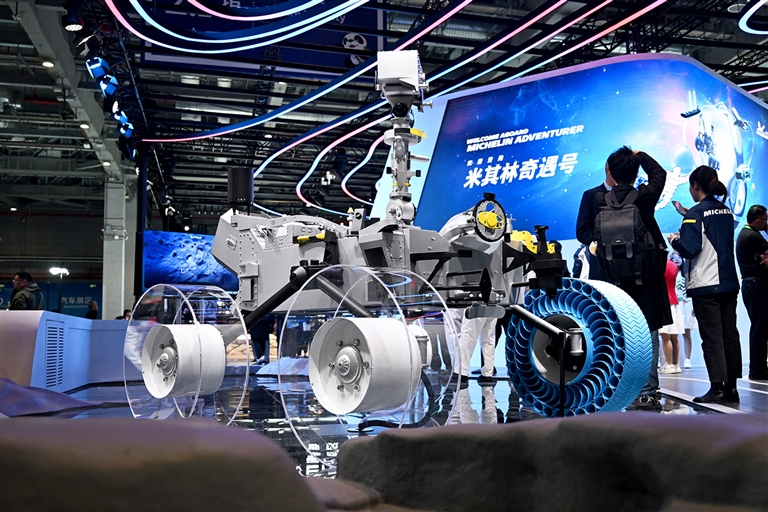 这是11月6日在第七届进博会汽车展区拍摄的在亚洲首次亮相的米其林月球探测车轮胎。 正在上海举行的第七届中国国际进口博览会上,众多首发首展的新科技、新成果、新展品亮相。 □新华社发 (陈浩明摄)
