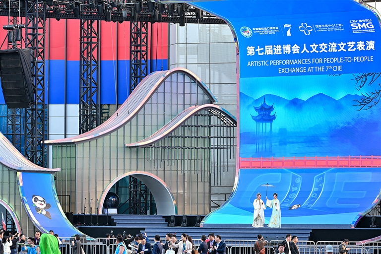 11月5日,演员在第七届进博会中央广场表演昆曲《拜月记·踏伞》。 正在上海举行的第七届中国国际进口博览会推出丰富的人文交流活动,通过非遗展示、文艺表演等方式促进中外交流。□新华社记者 张 铖摄