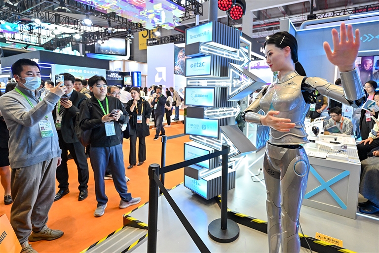 11月6日,观众在第七届进博会技术装备展区观看一款人型机器人跳舞。 正在上海举行的第七届中国国际进口博览会技术装备展区汇聚高端装备,展示前沿技术,搭建促进新材料领域创新发展的国际交流平台。 □新华社记者 张 铖摄