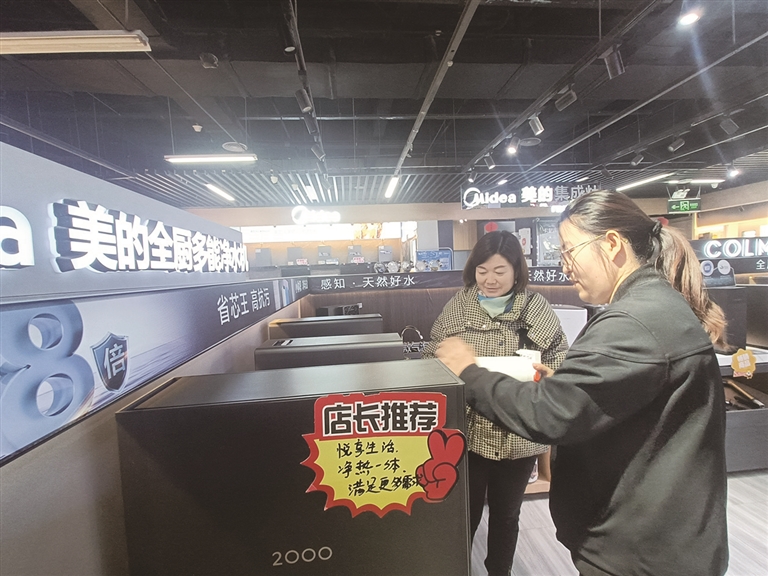 作为家电以旧换新主渠道之一,昌吉苏宁易购商贸有限公司通过增加产品供给,加大补贴力度,升级“国补、厂补、苏宁补”三重补贴激发消费者购物热情——在最高20%政府补贴的基础上,再叠加10%的苏宁补贴和10%的工厂补贴,消费者最高可享受40%的换新补贴。“‘国补’激发消费活力,家电以旧换新持续火热。‘双十一’期间,嵌入式冰箱、大屏电视、嵌入式蒸烤一体机等新质家电消费增长迅猛,一级能效零冷水燃气热水器、健康新风空调、节能洗干一体机等绿色健康家电‘火速出圈’。截至11月12日,我们门店客流增长超三成,以旧换新销售增长257%。其中,空调、冰洗以旧换新增长均超2倍。”昌吉苏宁易购商贸有限公司汇嘉时代昌吉购物中心店店长张晓斌介绍。