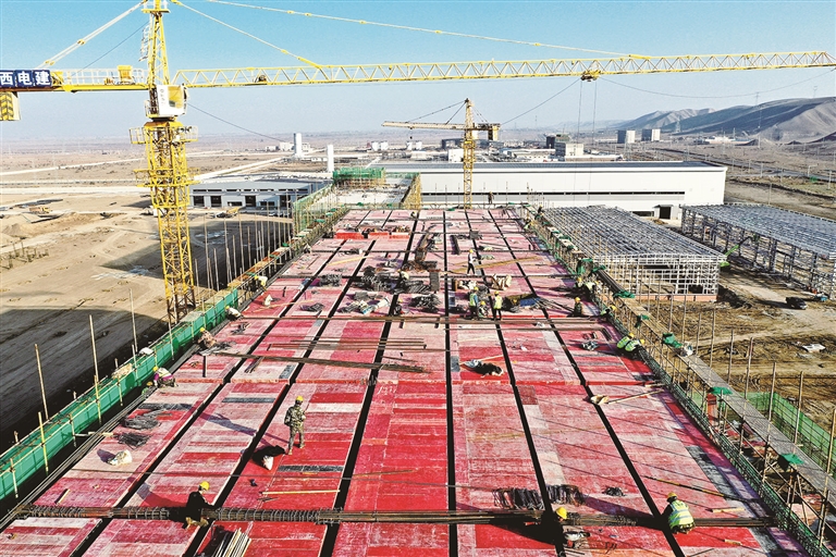 11月6日,吉木萨尔县北三台循环经济工业园区,新疆汉行科技有限公司年产6万吨煤基钠离子电池负极材料基地和6万吨锂电池负极材料一体化基地项目正在火热建设中。 □本报记者 常谊谊摄