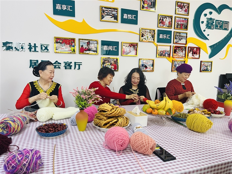 近日,在昌吉市建国路街道嘉顺社区“睦邻会客厅”,居民群众编织围脖、围巾。 □本报记者 左晓雨摄