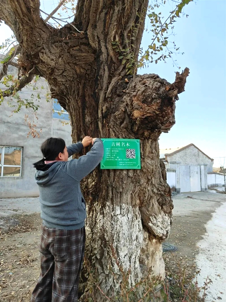 为确保此次行动顺利开展,阜康市城关镇农业服务中心工作人员前期深入各村(社区)开展实地调查,全面搜集每一棵古树的树种、树龄、树高、胸径、冠幅、分布特点等数据,建立“一树一档”数字档案库。此次共摸排古树15棵,并为其中3棵百年以上古树名木进行挂牌。保护牌上附有树木的基本信息和二维码,只需扫描二维码,即可获取树木详情以及保护措施,不仅方便群众了解古树名木,还为生态保护注入了新的活力。