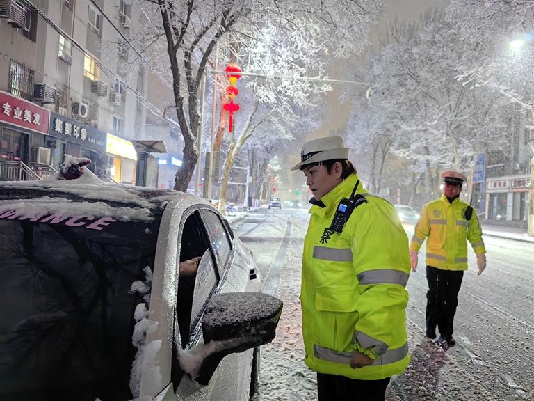 为迎战此次降雪天气,昌吉市公安局交警大队通过定点指挥和动态巡逻相结合的方式,加强城区和郊区重点路段交通疏导指挥。11月22日23时30分许,记者在昌吉市文化西路上看到,交警一边执勤,一边提醒驾驶员尽快驶离停靠在路边的车辆。