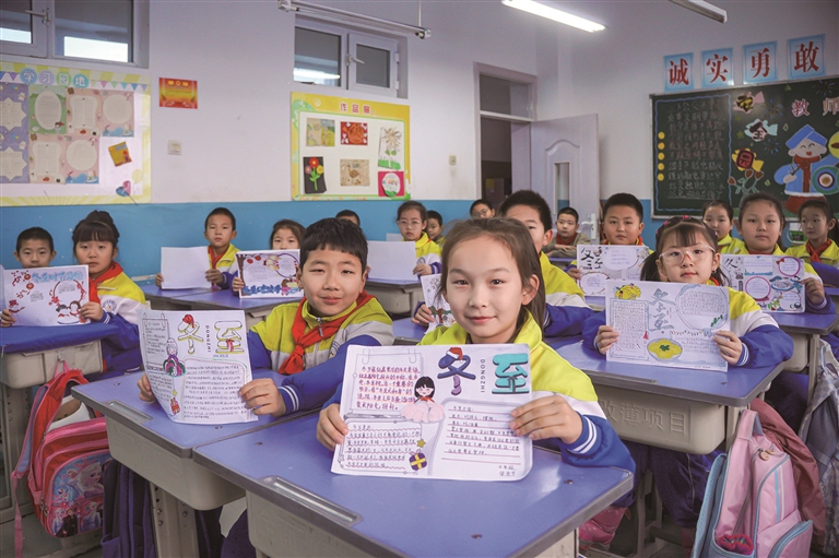 12月20日,昌吉市滨湖镇中心学校三年级(1)班的学生展示自己制作的冬至主题手抄报。□杨 斌摄