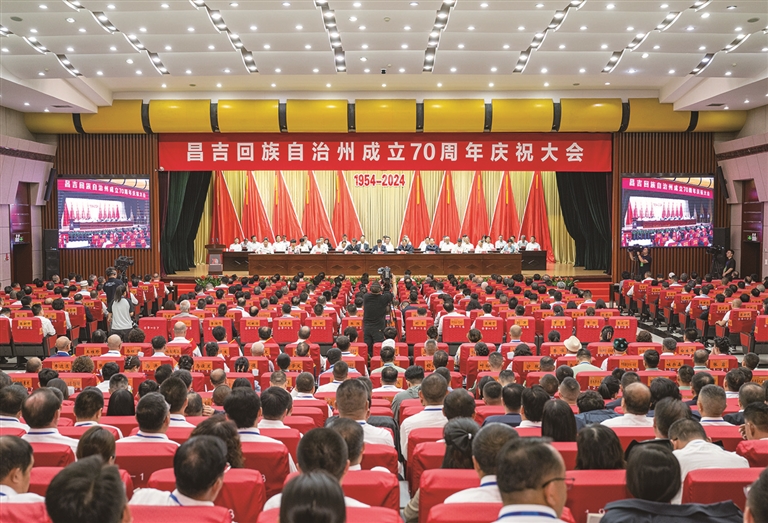 9月3日上午,昌吉回族自治州成立70周年庆祝大会在昌吉市举行。全国人大常委会、国务院致贺电。70年来,在党中央的亲切关怀下,昌吉州各族干部群众不忘初心、牢记使命,团结奋斗、担当作为,城乡面貌发生巨大变化。特别是党的十八大以来,在以习近平同志为核心的党中央坚强领导下,昌吉州经济快速发展,民族团结,社会稳定,人民生活显著改善,各项事业取得全方位进步、历史性成就。1954年—2023年,昌吉州地区生产总值从0.47亿元跃升至2329.52亿元,按现价计算,增长了4955倍,比1954年翻了12番。