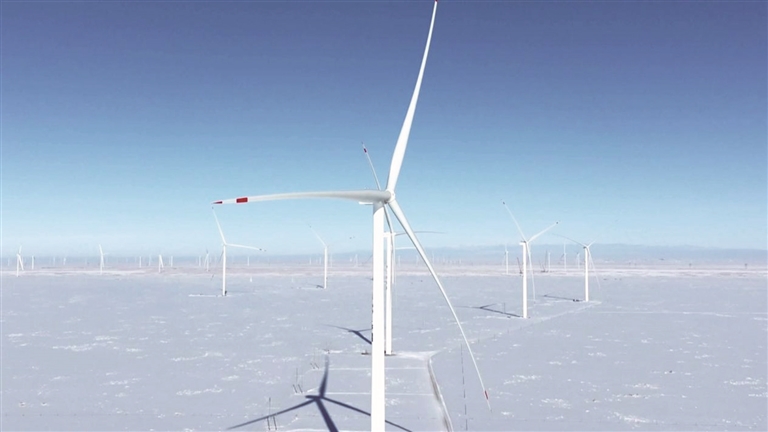 1月15日,木垒县华电80万千瓦风电场,风机正满负荷运转,源源不断地将风能转化为电能。□王梦君摄