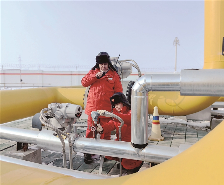 收拾工具、穿好工服、戴上保暖安全帽后,赛力汗·哈力木别和同事们开始站内巡检。门一推开,寒风迎面袭来。沿着站内小道一路走一路检查,他们的眼睛扫过一个个仪表、一段段管道,脸冻得通红。