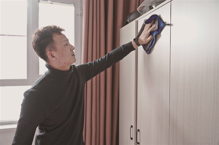 27岁的张磊来到准东开发区已经有3年了,直到去年7月住进保租房,他才有了家的归属感。当天一大早,张磊就起床了,扫地、拖地、收拾衣物,将房间里里外外都打扫了一遍,一眼望过去,房间显得更加明亮舒适。