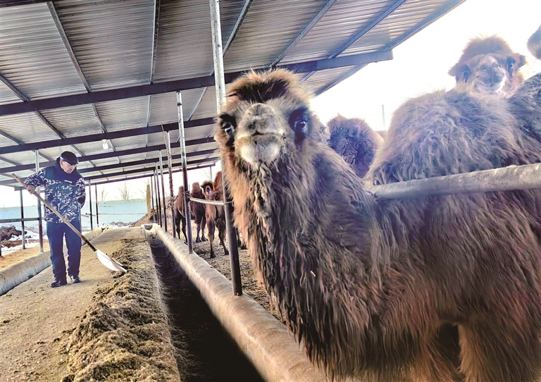 拜斯胡木中心村伟开畜牧养殖专业合作社负责人阿达力带着工人给骆驼拉料、添草,这里的670峰骆驼被他们养得膘肥体壮。
