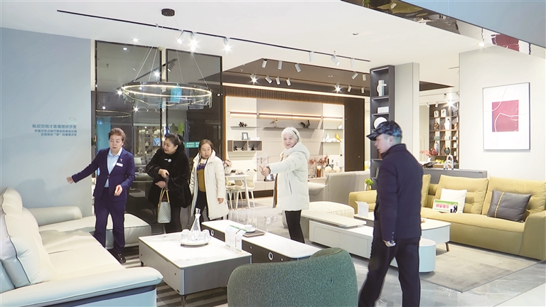 近日,在昌吉市统一美居建材城全友家居店内,不同风格的家具搭配摆放,市民在销售人员的带领下挑选沙发。