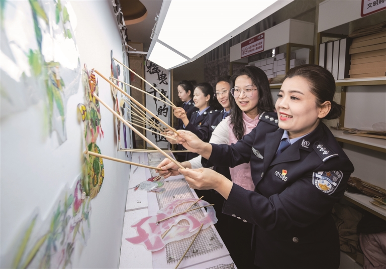 3月5日,昌吉边境管理支队部分女民警来到昌吉有戏皮影戏剧场,通过听取皮影戏介绍、观看皮影戏、体验皮影制作等方式,近距离感受非遗魅力。图为民警体验皮影艺术。□本报记者 何 龙摄