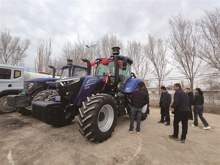 近日,吉木萨尔县金满园农机专业合作社社员在参观新引进的大型农机。