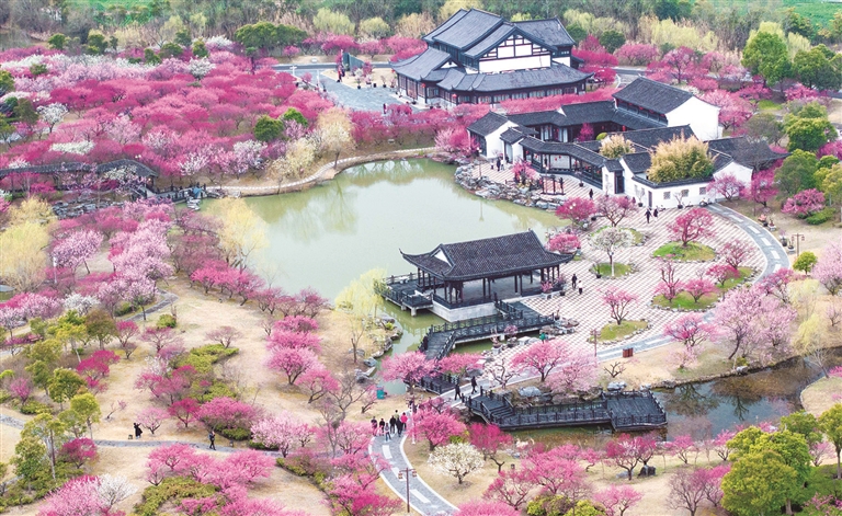 3月15日,游客在江苏省盐城市大丰区梅花湾景区赏花游玩(无人机照片)。 春暖花开,万物复苏,生机盎然的春日画卷在神州大地徐徐展开。□新华社发(周社根摄)