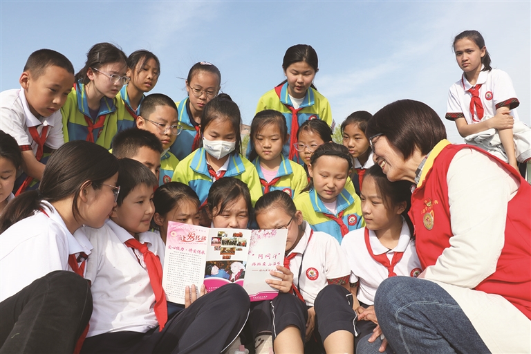 4月18日,呼图壁县委宣传部联合阿同汗志愿者服务队走进县第二小学,开展“文明实践进校园 呵护心灵助成长”主题宣讲活动,全校1700名师生代表聆听宣讲。图为服务队队员与学生展开交流互动。 □王文霞摄