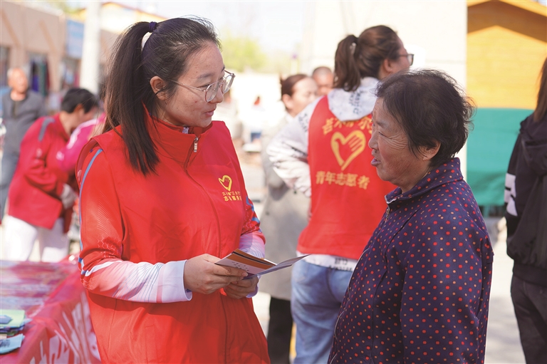 4月16日,吉木萨尔县三台镇青年志愿者走进居民身边,讲解城乡居民养老保险缴费档次、政府补贴、养老金计算等政策要点。□胡媛媛摄