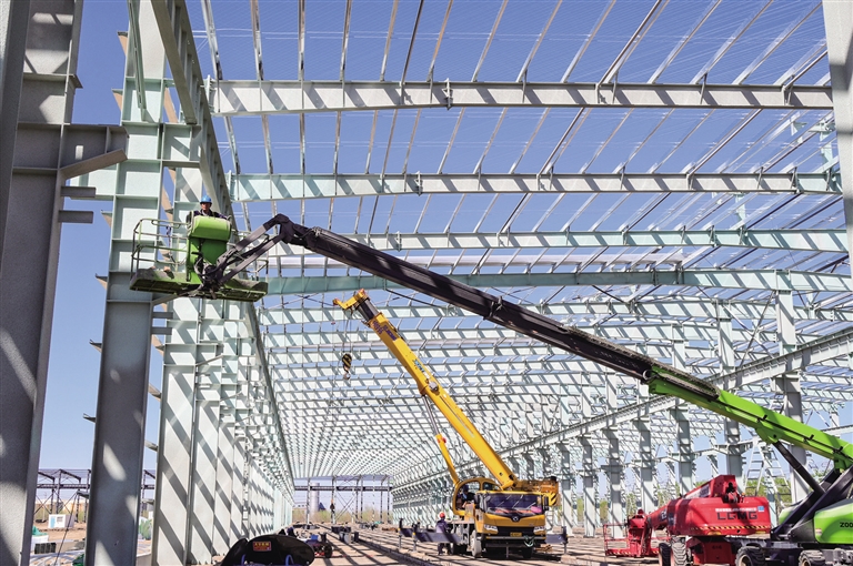 4月21日,工人在昌吉国家高新技术产业开发区兴通智能制造产业基地建设现场施工。该项目计划建设两期智能生产厂房,预计建成后可年产钢结构构件8万吨,将成为西北地区重要装配式建筑产业基地。□本报记者 陶维明摄