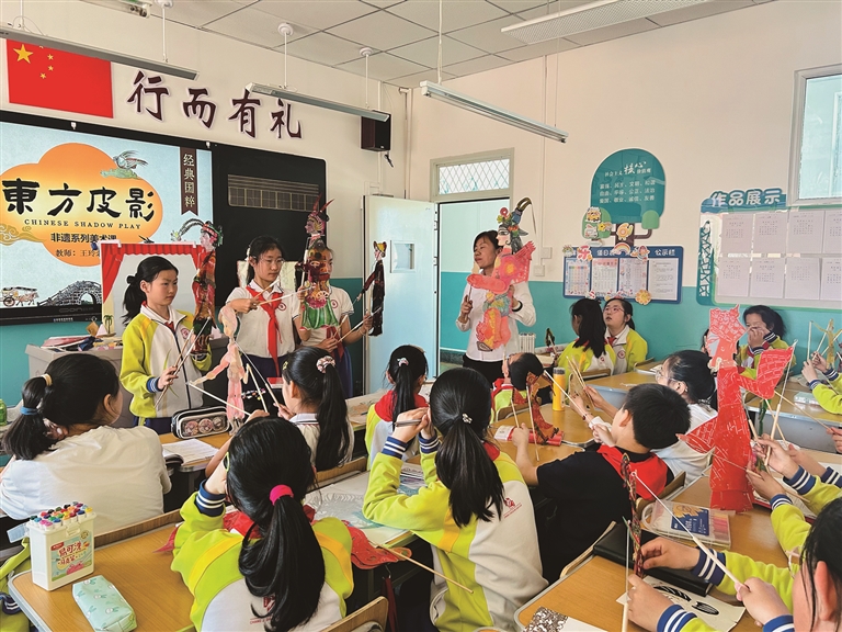 “注意操作脖杆,每个关节要灵活连接,皮影人物才能舞得生动。”美术教师王玲一边指导,一边对记者说,“目前,我们已经将皮影戏融入日常美术课堂,带领同学们探索光影世界。皮影戏就像‘会动的玩具’,同学们可以自己编剧本,制作皮影,进行皮影戏表演,每个学生都是皮影戏的传承人。”