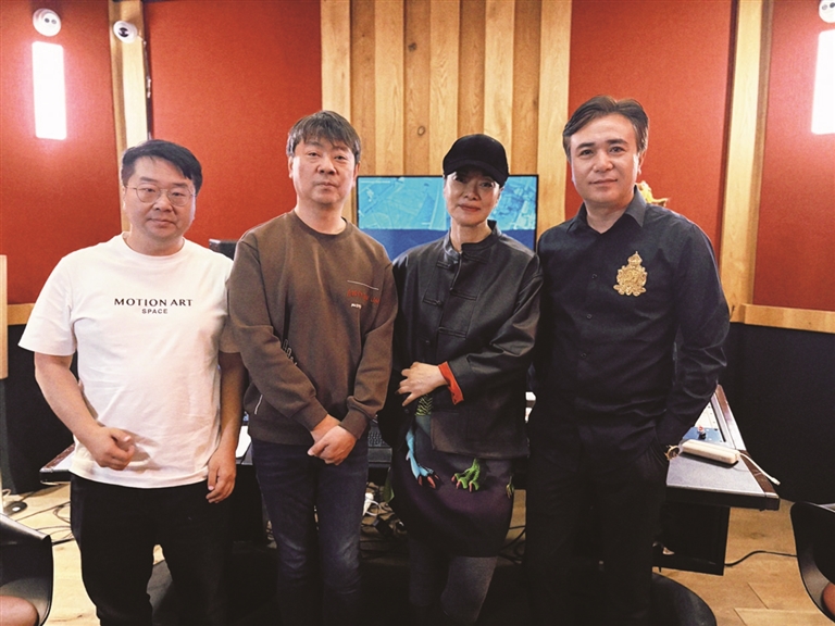 导演张忠(右一)、毛阿敏(右二)、作曲刘思军(左二)、刘烨(左一)在北京录音现场。