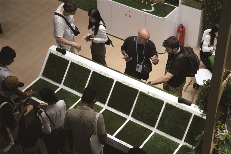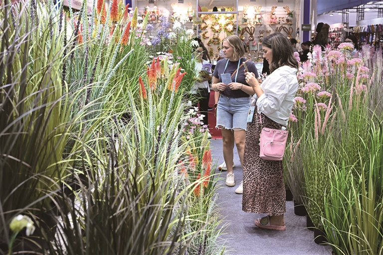 4月23日,在第137届广交会上,境外采购商观看仿真花草展区。