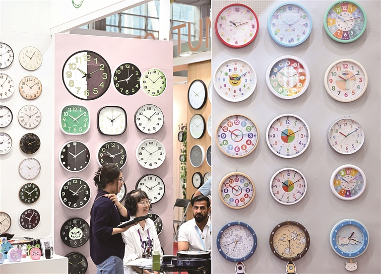 4月23日,在第137届广交会上,境外采购商在钟表展区洽谈。