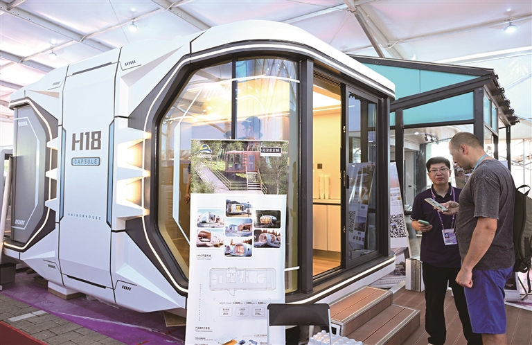 4月23日,在第137届广交会集成房屋专区,境外采购商在洽谈。当日,以“品质家居”为主题的第137届广交会第二期开幕。本届广交会首次设立集成房屋专区,展出活动房屋、模块化房屋、可拓展房屋等产品。