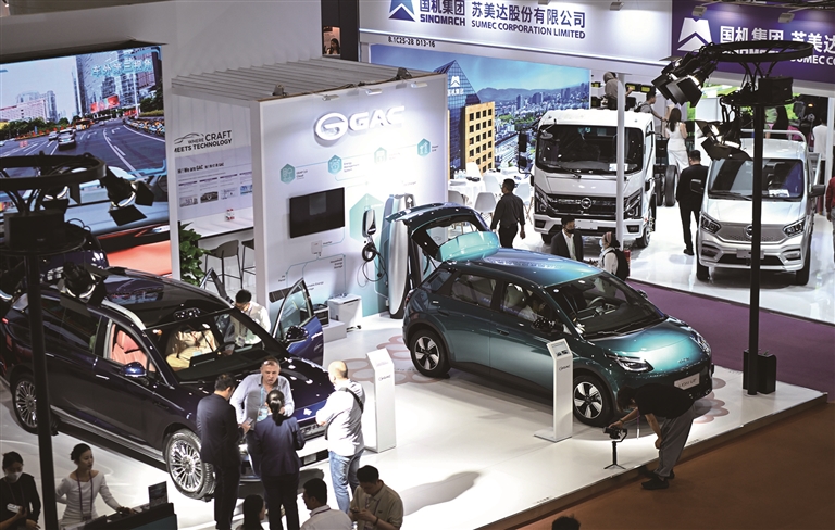 这是4月18日在第137届广交会上拍摄的新能源汽车展区。