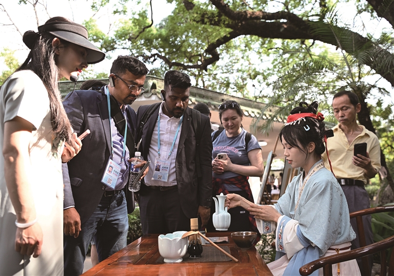 4月17日,在广州兰圃,参加第137届广交会的境外采购商观看茶艺表演。
