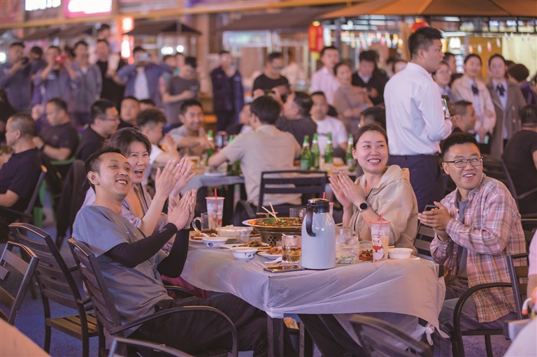 4月28日也是准东夜市开市的日子,沉寂许久的夜市一下子热闹起来。商家们热情洋溢,湘菜、川菜、新疆菜的香味交织弥漫,火锅、干锅、砂锅热气腾腾,人们惬意地撸着嗞嗞冒油的羊肉串,喝着爽口的啤酒。当晚9点的夜市舞台更是焦点所在,随着灯光骤亮,主持人登场,昌吉州“百日文化广场”开幕仪式(准东)暨昌吉州艺术剧院2025年“我们的中国梦——文化进万家”及优质文化“七进”下基层惠民演出拉开帷幕。《中国歌最美》的动感旋律响起,吸引众多干部职工围聚舞台四周。舞台上,舞蹈《踩春雨》的演员们柔美灵动,女声合唱《醉美最近是昌吉》歌声婉转悠扬,小品《酒驾》诙谐幽默,男声独唱原创歌曲《腾飞吧准东》振奋人心,《苹果香》的旋律更是让观众忍不住跟唱。还有多样的乐器演奏,精彩节目接连不断,台上台下互动频繁,一片欢乐海洋,直至结束曲唱完,观众仍意犹未尽。“今天的演出太精彩了,平时工作忙,晚上来夜市逛逛,还能看到这么好看的节目,感觉整个人都放松了,这就是实实在在的精神食粮。”正在夜市观看演出的金晓燕笑着说。
