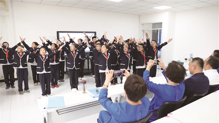 4月28日,由昌吉州党委宣传部指导,墨兰书社、昌吉州邮政分公司联合主办的阅读推广活动在准东五彩湾学校举行。活动现场,学生在集体表演节目《少年中国说》。□本报记者 卢增源摄