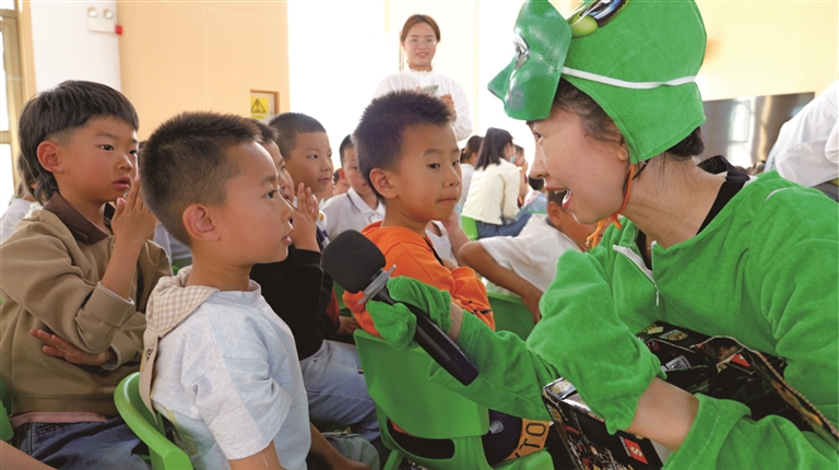 4月28日,昌吉州实验幼儿园准东分园举行“好看的童话剧进校园”阅读推广活动,昌吉州图书馆图书推广团队成员与小朋友互动。□本报记者 史海龙摄