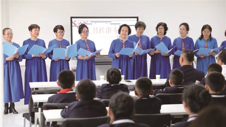 4月28日,由昌吉州党委宣传部指导,墨兰书社、昌吉州邮政分公司联合主办的阅读推广活动在准东五彩湾学校举行。活动现场,墨兰书社成员集体朗诵原创作品《读书之歌》。□本报记者 卢增源摄