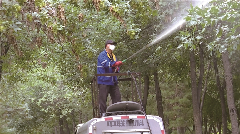 在葡萄酒公园附近,环卫工人采用专业设备,为道路两侧树木喷洒药物。“我们每天早上7点至12点对城区主干道、公园绿地开展药物喷洒作业,药效可持续7—10天。后续将持续做好病虫害防治工作,最大限度减少虫害对居民生活的影响。”玛纳斯高洁城市环卫服务有限公司园林主管赵慧勇说。