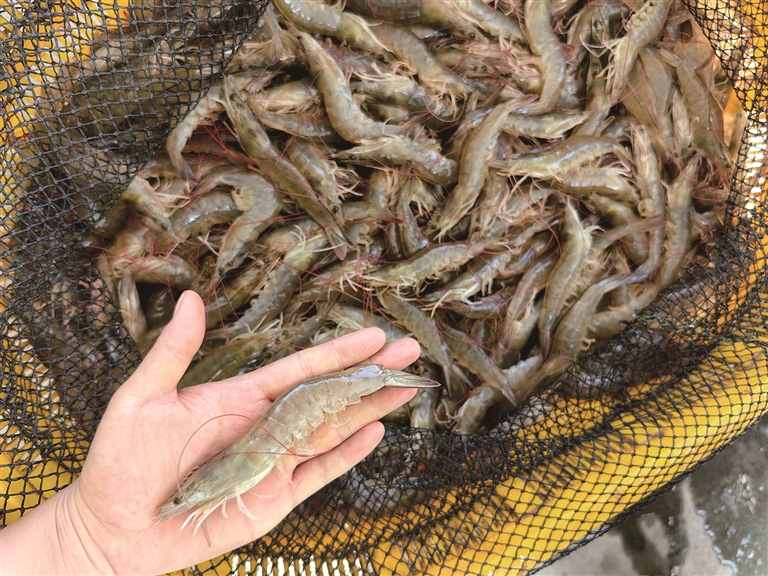 池塘边,养殖员熟练起笼,清亮透明、壳薄体肥的南美白对虾在网兜中翻腾跳跃,每只对虾的长度在12至15厘米左右。这些对虾经过秤、打包等一系列流程后,快速地被运向市场,“走”上市民餐桌。