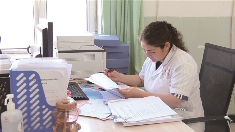 消除艾滋病、梅毒和乙肝母婴传播项目管理员加孜依拉正在整理最新一期的孕产妇筛查档案。 □吾拉恩·巴合提努尔摄