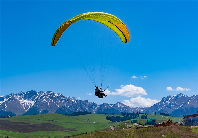 进入夏季,奇台县江布拉克景区迎来大批游客,景区内新增的滑翔伞、直升机低空游览项目备受青睐,为游客提供了俯瞰雪山草甸的独特视角。