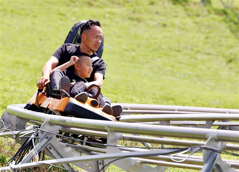 近日,奇台县江布拉克景区,游客在体验管轨式滑道项目。