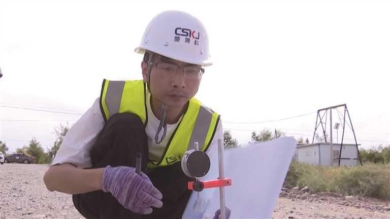 在玛纳斯县北五岔镇魏家场——石莫公路施工现场,工作人员正在检查路面各项指标情况。□张海洋摄