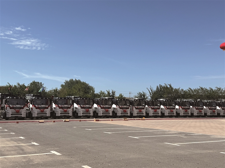 130辆新能源重型卡车整齐排列等待交接。□王梦君摄