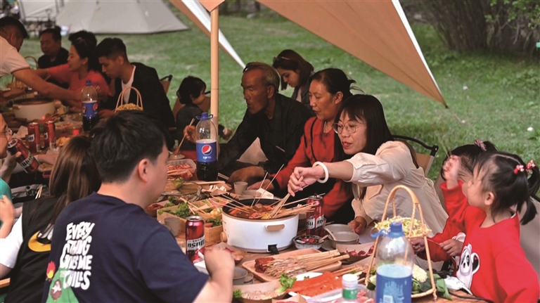 甘肃游客马向荣说:“夜晚在帐篷里听着虫鸣,看着满天繁星,白天品尝了正宗烤肉和大盘鸡,牧民也特别热情,这次露营体验太难忘了。”