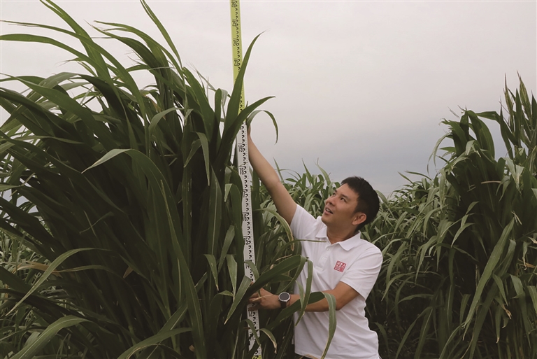 专家通过测量单株重、种植密度等指标对巨菌草进行综合测产。 □徐笑语摄