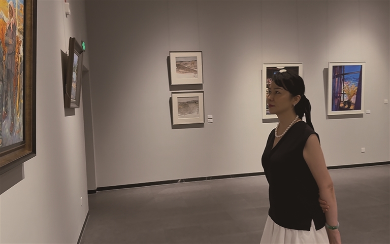 7月23日,吉木萨尔县“诗画乡村”美术作品展在乌鲁木齐市美术馆开幕,游客正在欣赏参展画作。□本报记者 耿雅薇摄
