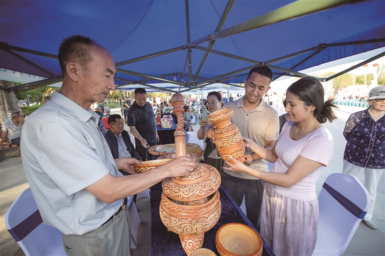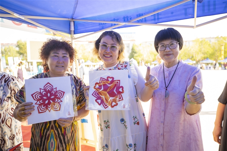 在非遗集市上,来自两地的非遗项目代表性传承人同台献艺。在集市展区,木垒县姑娘古丽娜尔正专注地学习国家级非遗项目浦城剪纸,她说:“这些花纹像我们草原的云纹,但技法更精细,我要把这项技艺学会。”另一边,福建游客张先生对自治区级非遗项目哈萨克族骨雕技艺作品爱不释手,由衷称赞:“没想到粗硬的骨头上能雕刻出如此细腻的图案,这就是中华文化的魅力!”