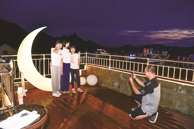 游客在贵州省平塘县克度“天文小镇”一家民宿露台的月亮模型前留影(7月9日摄)。