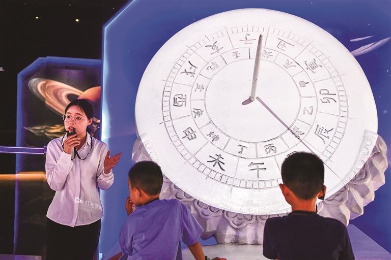 讲解员在贵州平塘国际天文体验馆给参观者讲解天文知识(7月10日摄)。