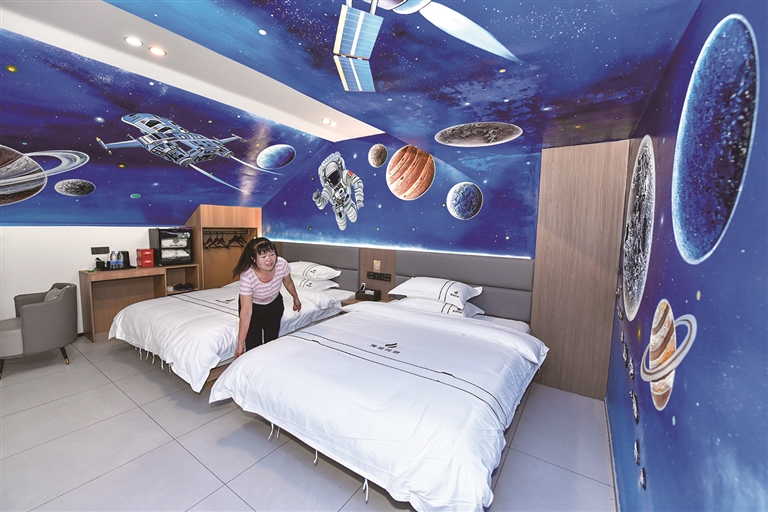在贵州省平塘县克度“天文小镇”,民宿负责人杨育梅在整理客房(7月9日摄)。
