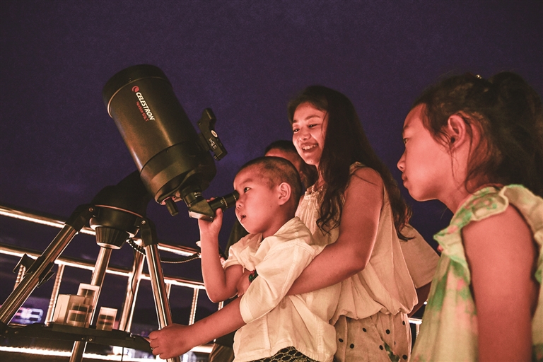 游客在贵州省平塘县克度“天文小镇”一家民宿露台通过望远镜观测星空(7月9日摄)。