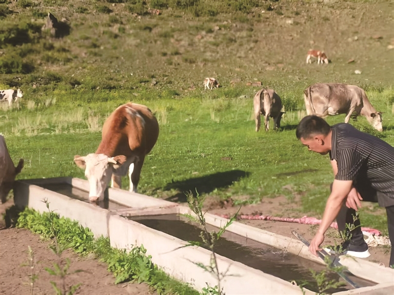 近日,牧民正在用新接通的水管为牲畜添水。□杨万虎摄