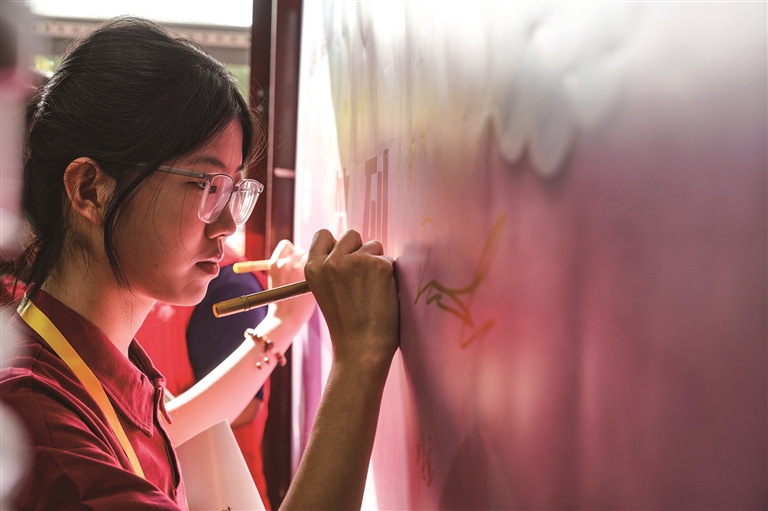 左图:8月6日,参加“泉昌情·心连京·丝路缘——祖国情·中华行”研学活动的华侨大学港澳台侨师生在活动墙上签名。 □本报记者 常谊谊摄