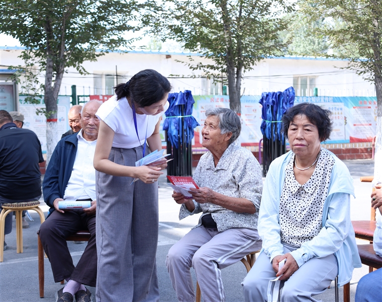 8月6日,在昌吉市滨湖镇滨湖村,昌吉州、昌吉市民政局的工作人员向群众发放涉及社会救助政策的宣传资料。□本报记者 付小芳摄